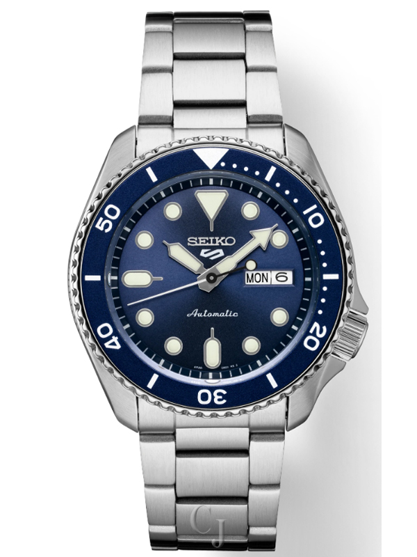 Seiko 5 Sports, Manual and automatic winding capabilities, 21,600 vibrations per hour, Power reserve: approximately 41 hours, 24 jewels, Blue sunray dial, Blue unidirectional rotating bezel, Day/date calendar, LumiBrite hands and markers, Case diameter: 42.5mm, Stainless steel case and bracelet, Water-resistant to 10 bar, 100 meters (300 feet), Caliber 4R36