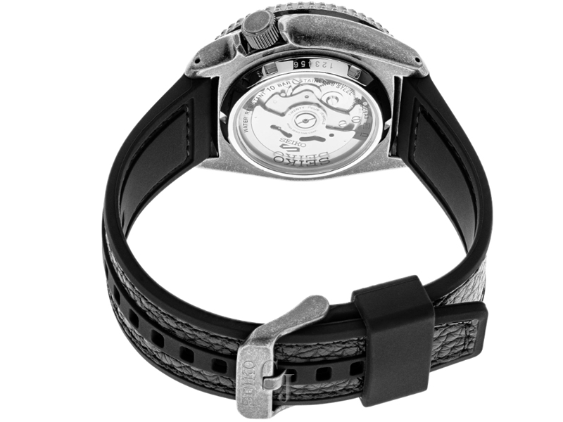 This is a new Seiko automatic 5 Sports watch that features a Seiko 24 jewel automatic (self-winding, hand wind, hacks) movement. The highly textured dial has a day and date display at 3:00, luminous hands and markers treated with Lumibrite for low light visibility, an offset crown at 4:00, a uni-directional rotating bezel, a Hardlex mineral crystal and an exhibition window screw-down case back. 42.5mm diameter (aged-patina look) stainless steel case. It comes on a textured leather strap and it includes manual and Seiko box.