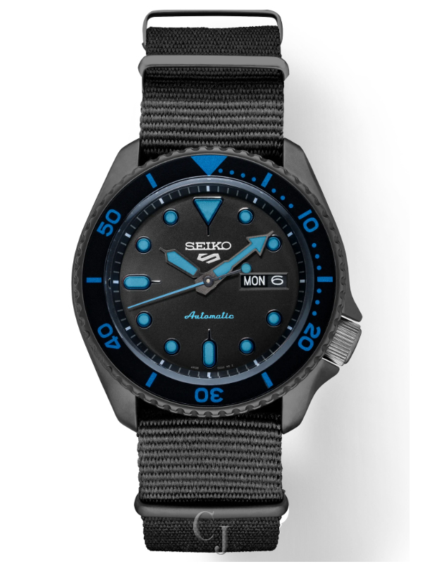This is a new Seiko automatic 5 Sports watch that features a Seiko 24 jewel automatic (self-winding, hand wind, hacks) movement. The black dial has a day and date display at 3:00, blue luminous hands and markers, an offset crown at 4:00, a uni-directional rotating bezel, a Hardlex mineral crystal and an exhibition window screw-down case back. 42.5mm diameter black PVD (hard coated) stainless steel case. It comes on a black nylon strap with black PVD keepers and buckle. Manual and Seiko box are included.