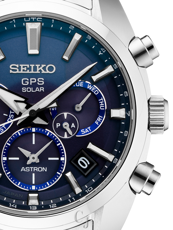 Astron Solar GPS Dual Time. A revolution in precision timekeeping. Fifty years ago, Seiko transformed watchmaking with the first commercially available quartz watch, the Astron. Today, Seiko takes another step forward with the new Astron, reflecting the strong, sleek lines of the 1969 original, while providing the highest degree of accuracy possible in a wristwatch — effortlessly. GPS controlled for high-speed time and time zone adjustment to 39 time zones, with daylight saving time function, this remarkable timepiece includes a perpetual day and date calendar correct to the year 2100, dual time with time transfer function, and am/pm indicators. The magnetic resistance is 4,800A/m and, to ensure smooth operation, the watch is equipped with a signal reception result indicator and power save function.
