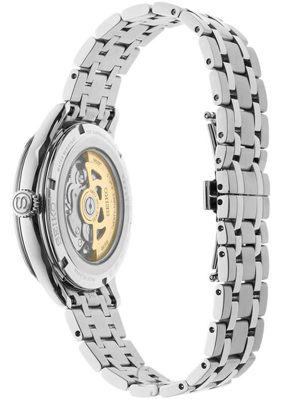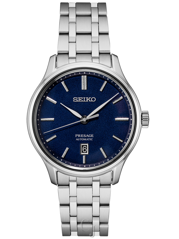 From the Presage Collection Fine mechanical watchmaking from Japan Manual and automatic winding capabilities 21,600 vibrations per hour Power reserve: approximately 41 hours 23 jewels Blue paving stone textured dial Textured indices,Date calendar,Dual-curved sapphire crystal Screwdown see-through caseback,Case diameter: 41.7mm Stainless steel case and bracelet Deployment clasp with push button release Water-resistant 50m/165ft /5atm, Caliber 4R35.