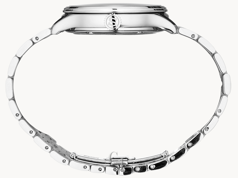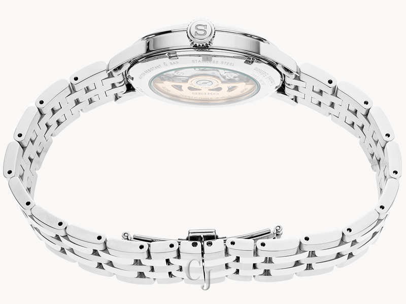 The Presage series Seiko SRPE17 (known colloquially as “Cocktail Time”) is powered by the 23-jewel Seiko 4R35 self-winding movement that can also be hand wound and hacked. The case has a polished finish and a radiant black textured dial with silvertone hands and hour markers. A date display is shown at the 3 o’clock position. The stainless steel bracelet has a butterfly-style deployant clasp for easy on and off. A scratch resistant Hardlex crystal is used along with an exhibition back that allows you to view the movement in action. Water resistant to 50 meters.
