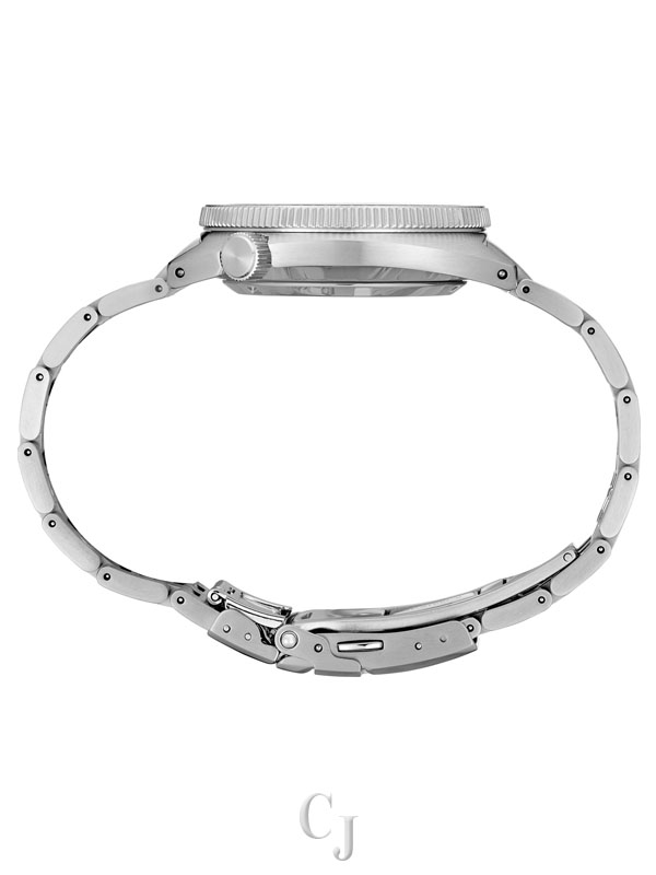 Prospex Automatic Diver’s Watch. Designed for those who treat life as the ultimate adventure, the Seiko Prospex line meets every challenge with technological excellence and style. Part of a rich legacy of innovation in high-intensity timekeeping, Prospex continues to celebrate a long history of sports watch excellence with re-creations and re-interpretations of landmark achievements. With the thinnest case to date of any Seiko automatic diver’s watch, as well as an elegant, yet sporty five-row bracelet, this sleekly updated timepiece incorporates the distinctive cushion-shape and recessed crown of one of Seiko’s most iconic designs. Crafted of stainless steel with super hard coating, this versatile watch includes a curved sapphire crystal with anti-reflective coating on the inner surface, black uni-directional rotating elapsed timing bezel, screwdown crown and caseback, and a newly developed compact tri-fold clasp with secure lock and extender. The rich black dial features gold accents, a date calendar and LumiBrite hands and markers. Following ISO standards for scuba diving to depths of up to 200 meters, this exceptional timepiece offers manual winding capability and includes a 24-jewel automatic movement with a frequency of 21,600 vibrations per hour and a power reserve of approximately 70 hours. 200m Water Resistant.