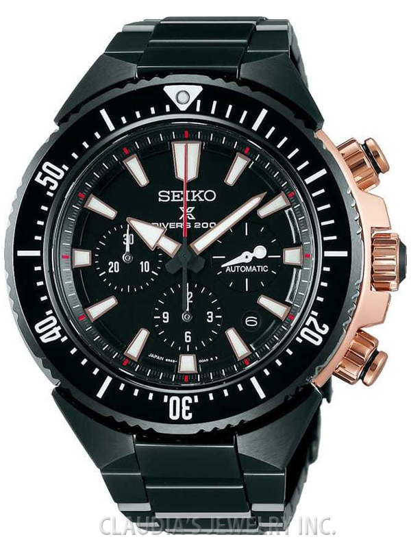 Seiko Prospex Transocean Diver watch model SBEC002 powered by automatic chronograph movement with manual winding mechanism. Stainless steel black PVD and rose gold PVD plated case and bracelet. One-way rotating 0-60 black zirconia ceramic bezel. Black color dial with date calendar and large luminous hands and markers. Water resistant to 200 meters.