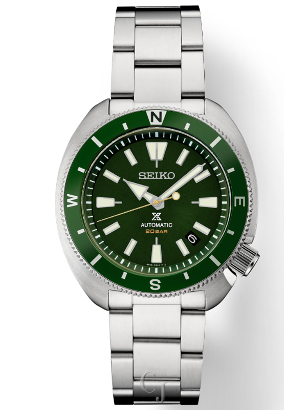 Prospex Land, Designed for rugged activities, Green rotating compass bezel, Emergency code listing on screwdown caseback, Automatic with manual winding capability, 21,600 vibrations per hour, Power reserve: approximately 41 hours, 23 jewels, Green sunray dial, Date calendar, LumiBrite hands and markers, Sapphire crystal for superior scratch resistance, Screwdown crown and caseback, Case diameter: 42.4mm, Stainless steel case and bracelet, Tri-fold push button release clasp, Water-resistant to 20 bar, 200 meters (660 feet), Caliber 4R35