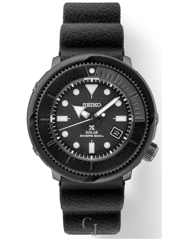 This Seiko PROSPEX “Street Series” is just the latest innovative design inspired by the original 1975 Seiko diver’s, this new timepiece features the same iconic case protector, in a more compact urban sporty style. The SNE567 wristwatch is a diving piece with a 200 meter water resistance and screw down crown strategically positioned at 4:00 for increased comfort that provides added security against moisture and dirt intrusion. Equipped with a bi-colored black and grey aluminum rotating uni-directional 120 click elapsed timing bezel, meets ISO standards for scuba diving. The 46.7mm black stainless steel case has a durable, light-weight high-tech protective shell exterior with decorative black-ion metal rivets. A black distressed patterned dial with high-visible luminous hands, markers and appendages makes this wrist watch easily readable in any environment. Seiko’s own V157 caliber is powered by light with a 10-month power reserve once fully charged. Fitted with a black vintage leather patterned rubber silicone accordion shaped strap with tang buckle with black ion finished safety keeper to keep your watch secure and in place.