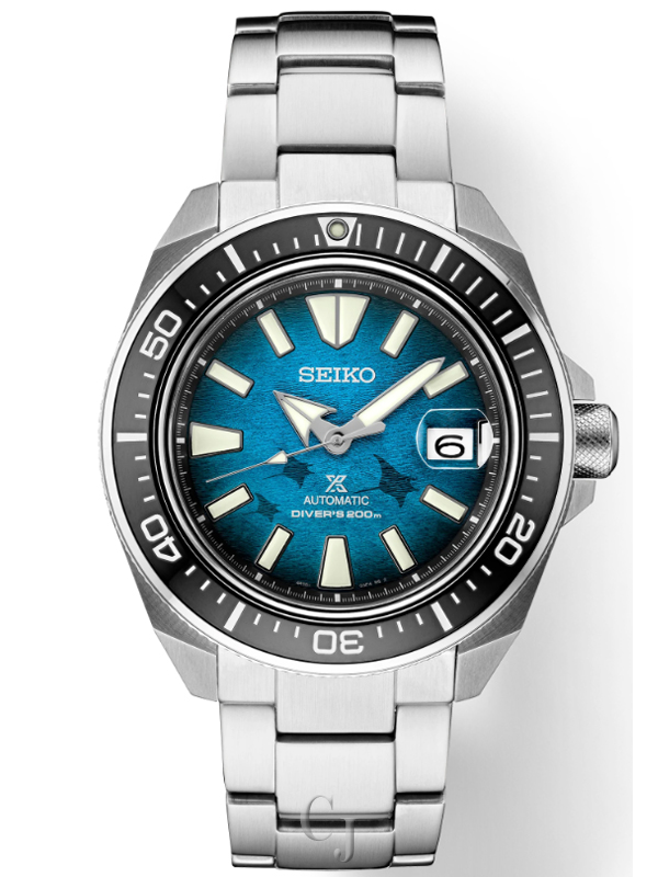 Prospex Special Edition Automatic Diver. Designed for those who treat life as the ultimate adventure, the Seiko Prospex line meets every challenge with technological excellence and winning design. Inspired by Seiko’s most iconic diving styles, this distinctive Special Edition evokes the world view of a manta ray with the gradated blue of the dial suggesting the variations in sunlight as it penetrates deep into the ocean, heightened by a stamped pattern suggesting waves. For reliable timing in rough waters, the 23-jewel automatic movement beats at a frequency of 21,600 vibrations per hour, with a power reserve of approximately 41 hours, and can be wound manually or automatically. With magnified date calendar and LumiBrite hands and markers, the dial is framed by a black ceramic one-way rotating elapsed timing bezel. This high-intensity timepiece, in stainless steel, with secure screwdown crown and caseback, and anti-reflective sapphire crystal, follows ISO standards for scuba diving. 200m Water Resistant