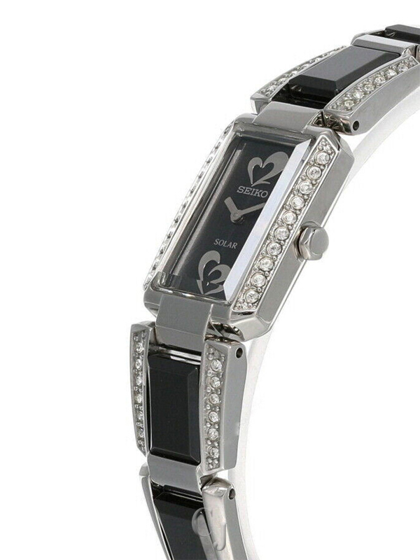 This elegant Seiko Solar SUP187 women’s watch combines a sleek black design with durable stainless steel and black ceramic components. Its solar movement ensures reliable timekeeping while being eco-friendly. The scratch-resistant Hardlex crystal adds durability to the watch’s elegant appearance, making it a stylish and practical accessory for any occasion.