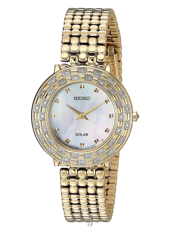 This jewelry inspired, art-deco Ladies’ timepiece is designed with a gold finish stainless steel case and bracelet with 36 diamonds adorning the bezel and a mother-of-pearl dial. Powered by any light energy, its Solar Cell is energy-efficient with a 12-month power reserve once fully charged. No battery change is required. 30M Water Resistant