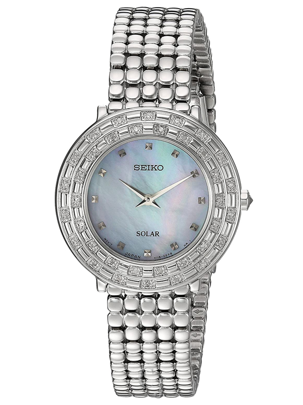 Stainless steel case with a stainless steel bracelet. Fixed stainless steel bezel set with crystals. White mother of pearl dial with silver-tone hands and index hour markers. Dial Type: Analog. Seiko caliber V115 quartz movement. Scratch resistant Hardlex crystal. Pull / push crown. Solid case back. Round case shape. Case size: 29 mm. Case thickness: 7 mm. Band width: 13 mm. Fold over clasp with a safety release. Water resistant at 30 meters / 100 feet. Functions: hour, minute, solar-powered. Additional Info: 36 diamonds. Dress watch style. Watch label: Japan Movt. Seiko Tressia Solar Crystal White Mother of Pearl Dial Ladies Watch SUP373.