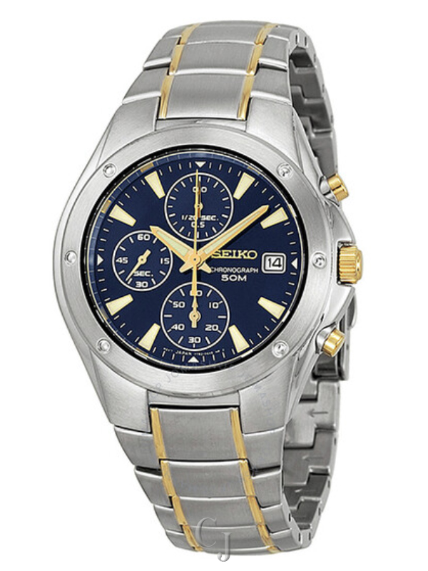 Stainless steel case with a two-tone (silver and gold-tone) stainless steel bracelet. Fixed stainless steel bezel. Blue dial with gold-tone hands and index hour markers. Minute markers around the outer rim. Dial Type: Analog. Luminescent hands and markers. Date display at the 3 o’clock position. Chronograph – three sub-dials displaying: 60 second, 60 minute and 1/20th of a second. Quartz movement. Scratch resistant hardlex crystal. Solid case back. Case diameter: 41 mm. Round case shape. Band width: 20 mm. Deployment clasp. Water resistant at 50 meters / 165 feet. Functions: chronograph, date. Additional Info: date display at 3 o’clock. Casual watch style. Watch label: Japan Movt. Seiko Chronograph Two-Tone Men’s Watch SND585.