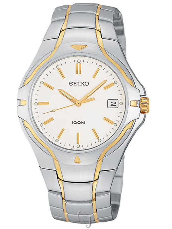 Model: SGE506, Manufacturer: Seiko, Series: Dress, Type: Men’s watch, dress watch, Diameter: 40.00 mm, Case: Brushed/polished steel, Back case rear: Solid, Bracelet: Brushed and polished steel yellow gold toned steel, Dial: White with luminescent markers index markings, luminescent hands, Buckle: Folding clasp made of steel, Glass: Mineral, shatter-resistant, Bezel: Steel yellow gold toned steel, brushed/polished, Movement & Functions, Movement type: Quartz (battery powered),Seconds hand: Ticking, Date: Date, Water protection: 10 ATM, Other: Screw down crown