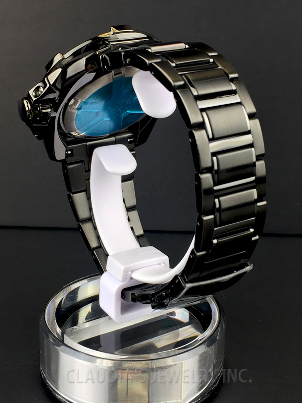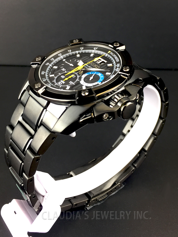 This Seiko men’s chronograph watch features a round black dial, silver tone hands and hour markers. All of these are framed in a black stainless steel case, scratch sapphire crystal, and tachymeter on the outer rim. It also offers a stainless steel bracelet secured with foldover clasp with single push button safety, Swiss quartz movement and water resistance up to 100meters/330feet.