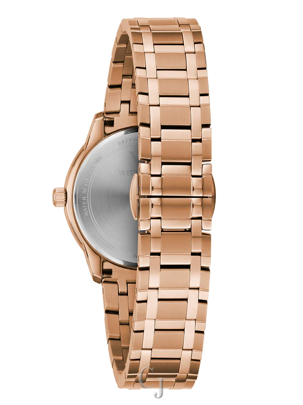 Continental flair meets streamlined design. Sublimely elegant with a single-diamond index at 12 o’clock on a rose-gold dial with and three-hand date feature. Housed in a slim-line snap-back rose gold-tone stainless steel case and signature bracelet with double-press deployant closure.