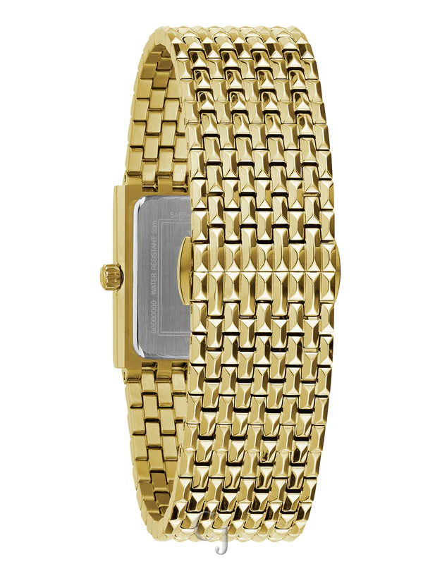 Cosmopolitan with a vintage flair, with 12 diamond markers set on a jet-black dial accented with silver-tone hands. From the fluidity of the high-polish gold-tone stainless steel faceted links of the bracelet to the bevel edges of the slim rectangular case, this timepiece feels truly luxurious on the wrist; with sapphire crystal and double-press deployant closure.