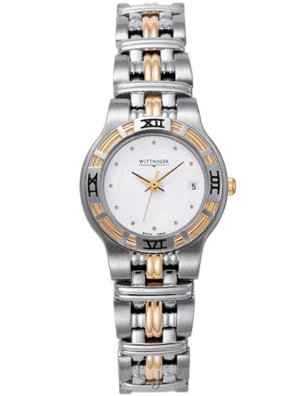 Wittnauer Watches Laureate Collection. Quartz movement, Analog date display, Sapphire crystal, Gold-tone hands and stick markers, Deployment buckle closure, Water-resistant to 30M/100 feet. Approximate case diameter/width 26 mm.